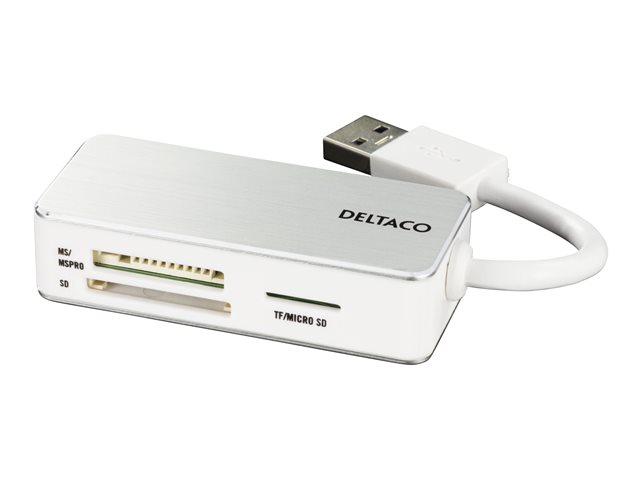 DELTACO USB 3.1 minneskortläsare, 3 fack, stödjer SDHC, Micro-SD, TF, MS PRO/DUO, vit/silver.